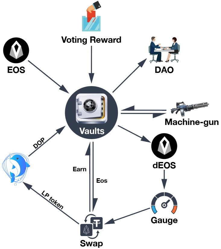 Users deposit EOS to the vault to get dEOS; return dEOS to get EOS+interest back